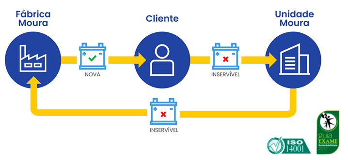Como funcionaO programa visa garantir a sustentabilidade por meio da gestão ambiental em todos os processos e esferas da Moura. A cada nova bateria vendida, uma antiga será recolhida.